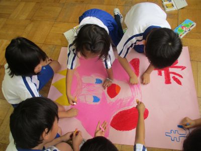大きく描いたカービィを丁寧にすき間なく、分担して色塗りをしています。