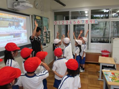 昼ねっこタイムの英語では、赤白帽をかぶって・・・