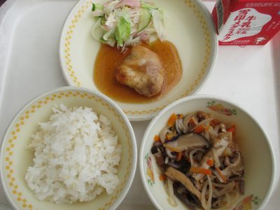 キャベツ、きゅうり、ハム、えのきが合わさったサラダです。えのきは暗い場所で栽培されているため白い色をしています。うま味が豊富なきのこ類ですが、そのうま味のもとは「グルタミン酸」や「アスギン酸」などのアミノ酸です。