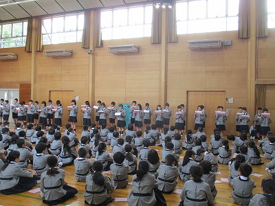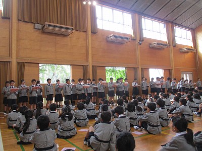 全校練習では、団長がいろいろな指示をします。その時、それぞれの組のみんなが、その言葉にしっかり耳を傾け、声を出したり、体を動かしたりできているかについて、全体で振り返りました。