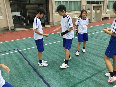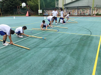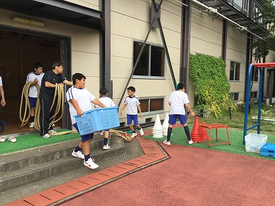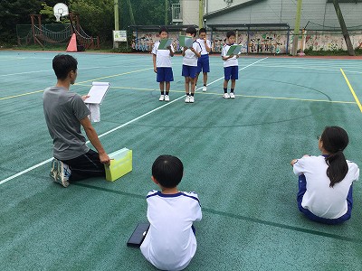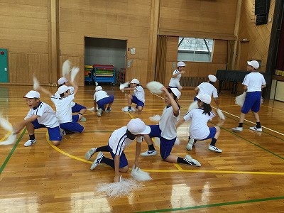 グラウンド中央に移動し、児童会競技『突然ボーナス2倍!玉入れ』の進行練習も。本部で案を練り、盛り上がって、しかも大逆転が期待できる全校競技に仕上がっています。