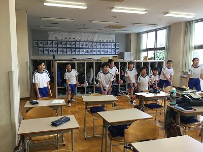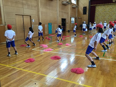 6年教室では、[準備体操係]が、徒競走直前の体操練習に取り組んでいました。体のどの部分を刺激しているのか、よく伝わるように、掛け声の練習も行っていました。