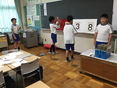 1年教室では、[採点・記録係]が、得点板を前に“結果発表”のリハーサルを行っています。