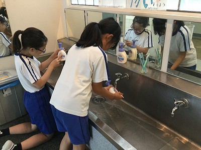 保健室では、[保健係]が、洗面所各所に設置している手洗い洗剤のボトルの点検を。量の確認とボトルの汚れ点検をしているとのこと。