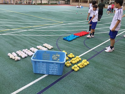 終わりには、玉入れ用の4色玉を、同数になるように数えていました。