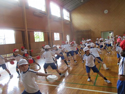 体育は、まず体育館でエイサーの動きの確認練習です。
