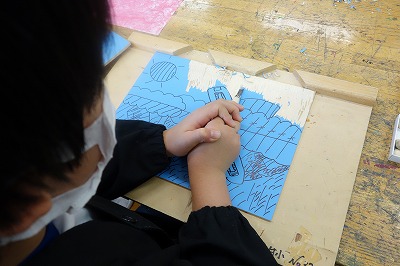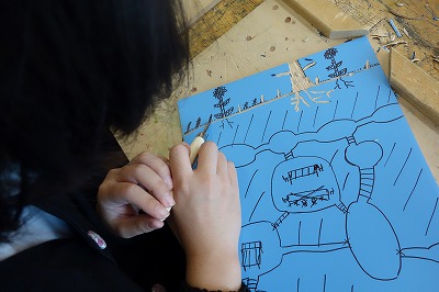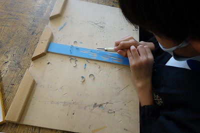 おためしもほどほどに、いよいよ版木に向かいました。初めてではあるものの版木をこまめに回しながら手前から前へと彫刻刀を動かして、細かいところや曲線、面を彫ることができました。