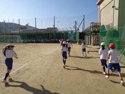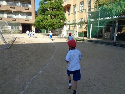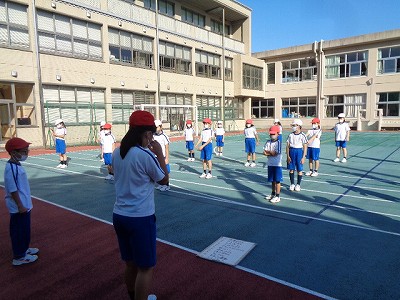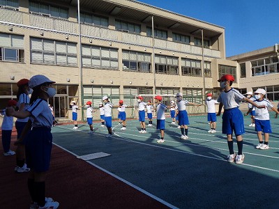 まずは、小学校運動場で準備体操。秋空広がる中、日直さんの号令がよく聞こえていました。