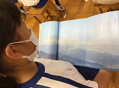 「頭を雲の上に出し 四方の山を見下ろして…」と歌詞の音読をしています。初めて出あう歌詞なのですが、なんだか読みやすい。