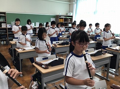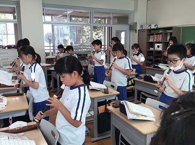 教室では、リコーダーの指の動きと息づかいを合わせること・やさしいタッチのタンギングに気をつけて吹く練習をしました。