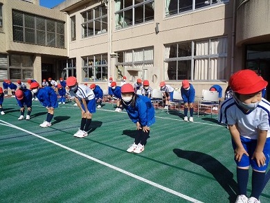 準備体操では、曲に合わせてストレッチ。