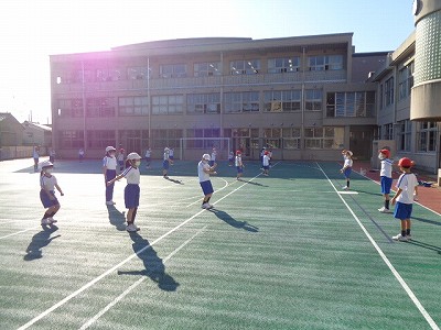 6時間目の体育、お天気もよく運動場で気持ちよく準備体操からです。