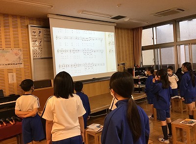 「♪マンガニ、雨とおどろう」の二部合唱の練習をしています。