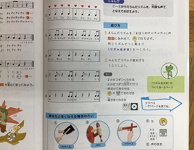 いま、3年生の音楽では、“リズム合わせ”を中心に学習を進めています。このページの5種類を組み合わせて、グループで“リズム合わせ発表会”を計画しています。