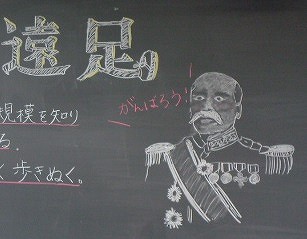 さて問題です。黒板に描かれたこの方は、どなたでしょう。