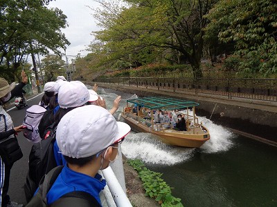 長良山を越えて、疏水沿いを歩いていると、観光船の姿が!観光船に向かって、「いってらっしゃ~い!」と、大きく手を振りました。水しぶきが、逆走を語っています。昔は、手こぎで上流を目指していました。