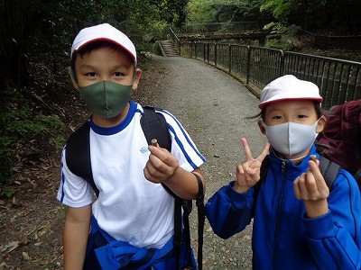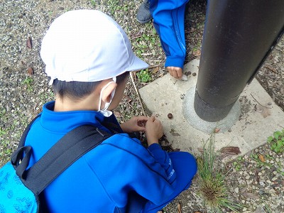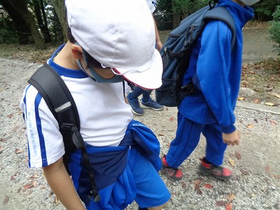 ヘトヘトになりながらも、一生懸命歩きます。それでも、歩みは続きます。重たい足を懸命に進めていると、なんとドングリを発見!休憩をかねて、しばし“秋みつけ”タイムとなりました。」