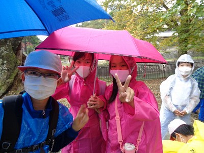 休憩を終え、さらに歩いていると、上からポツポツと雨が降ってきました。ここからはレインコート姿で歩きます!「これは汗なのか?雨なのか?」と言いながら、みんなたくましく歩いて行きます。