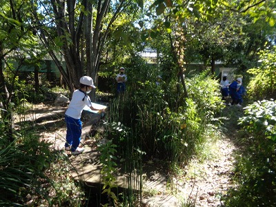 4時間目は、新出漢字「夕」「百」の練習をした後、「知らせたいな・見せたいな」の学習で知らせたいことを見つけるためにビオトープへ行きました。