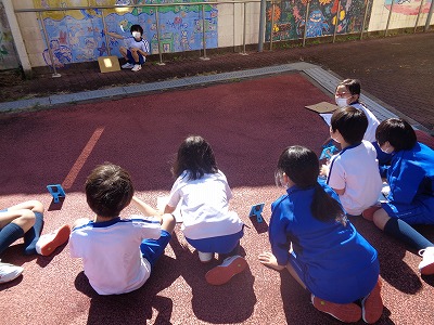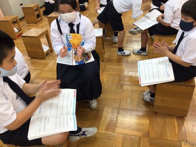 「咲かせよう ぼくらの花を 世界に虹を架けよう!」と歌う時は、世界を表す地球を形取った手の動きや、2の指で虹を弧に描く動きで表します。「もう一回歌おう!」と嬉しい言葉が返ってきました。