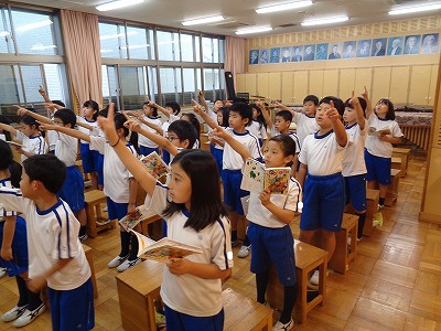 「♪ゆーうやけぐもを ゆーびさしてー」のパートでは、歌うだけでなく手をつけて表現しました。