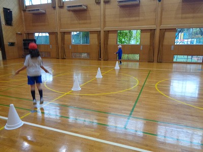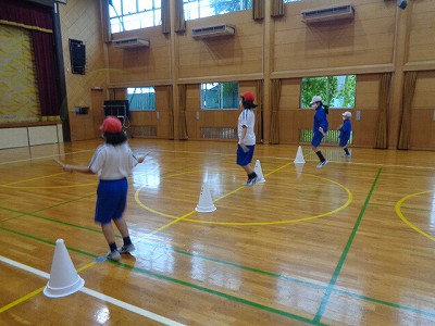 雨のため、体育館でなわとびをしました。いつものウォーミングアップの倍を走ってからのなわとびリレー。