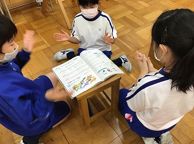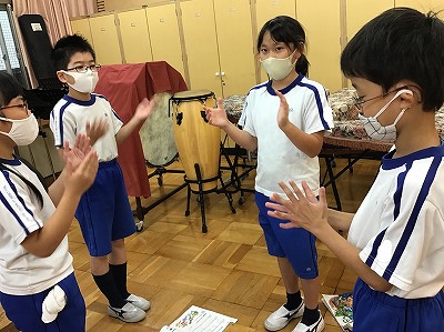 担当を決めるために、どのリズムが合わせやすいかを相談し、打ち合っています。「手がまっ赤になってきた~」と、互いのリズムに合わせることを楽しむ時間です。