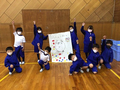 1時間目の学活では、赤組・白組それぞれで完成した応援ポスターとともに「エイエイオー」とメンバーで心合わせをしました。