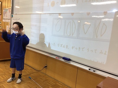リズム譜を提示して、一人ずつどんどん発表していきます。はじめに◇の休みを入れる友達、全部を半円にして「タタタタタタタタ」と、いそがしく打つ友達と、4拍にのって、ぴったり収まるリズムづくりができました。