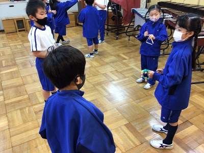 【音楽「リズム楽器でよびかけっこ」】