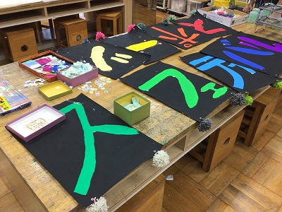 昼休みには、インフォメーション委員会のメンバーが造形室で、ポスター作りをしていたようです。体育の前にのぞくと、こんなポップなポスターが仕上がりつつ広がっていました。