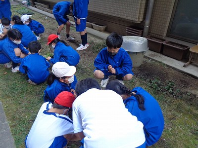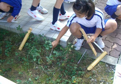 今日は晴天でしたので、日なたと日かげの地面の温度変化を調べました。まずは、理科の授業中に、それぞれの温度を測ります。