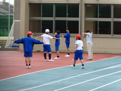 運動場では、準備体操係のスポーツ委員会のメンバーの姿が……。明日の本番では、練習の成果が見られることでしょう。