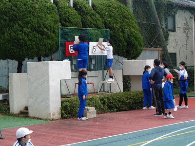 同じく運動場の掲揚台の前には、得点表示係のブックワールド委員会が練習。二人のタイミングを合わす様子が今日も見られました。