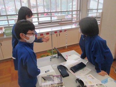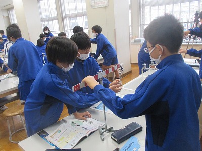 その後で「実験用てこ」を用いて、力が小さくなるところ、逆に大きくなるところを自分の手応えで確かめる実験をしました。