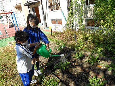 昨日から、休み時間を使ってれんげ班毎に「お花の苗植え」をしています。また、1年生と6年生で育てている大根の水やりも、6年生と一緒にがんばっています。