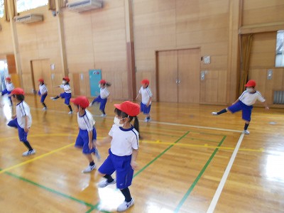 後半は、これまでに学習したステップを使って、ダンスの練習をしました。リズムにのってステップを踏みながら、上半身も動かしています。慣れるまでは難しいですが、みんなで楽しく踊れるように引き続き練習を進めます。