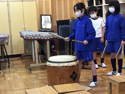今日は“わく打ち”を取り入れて、「ドンドコドンカン!」の軽快な音を感じ、リズムに合わせて、掛け声や動きにも気をつけて打つ学習に取り組みました。