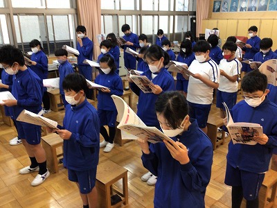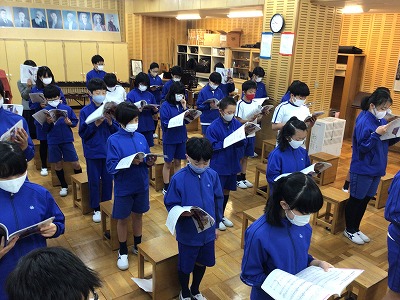 朝根っこタイムは、先週の全校遠足時に撮影した「れんげ班のグループ写真」をメンバー全員に配るために、6年生は各学年の教室を順番にまわりました。
