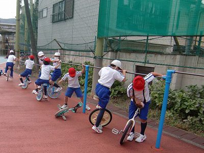 上手に乗る人が数人いますが、多くの人は鉄棒につかまってアイドリングの練習をしていました。