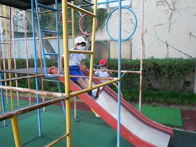 今朝も元気に遊具で遊んでいます。