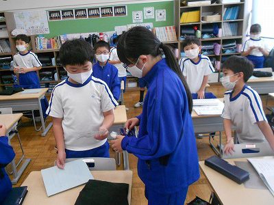 漢字練習を終えて、音読をしていると、6年生が全校遠足の写真を持って教室に来てくれました。