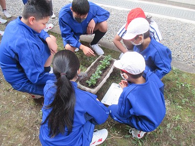 今週は、縦割りれんげ班で、お花の苗植えをしています。植えている苗は4種類あり、「キンギョソウ・ノースポール・ビオラ・パンジー」です。春に咲く花で、寒い時期には大きくならず、根をしっかり張ります。校長先生が花の写真を見せて、それぞれの特徴について説明してくれました。