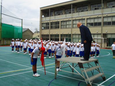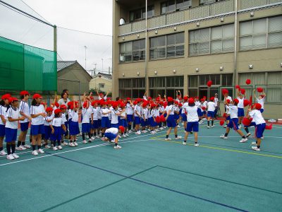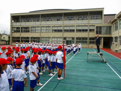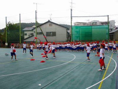 1時間目に、入場行進や開会式などの隊形、エール交換練習、玉入れの隊形を。