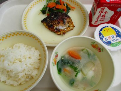 今日の献立は「さばの塩焼き、ほうれん草のごま和え、お月見汁、お月見ゼリー」でした。