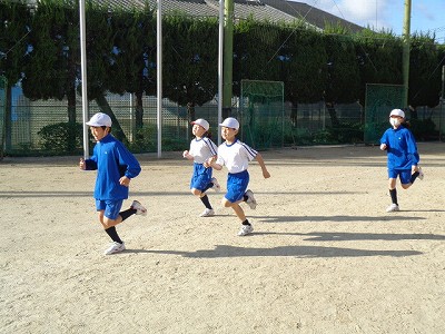 中高のグラウンドをお借りして、マラソンをしていますが、1周を1分という早いペースで走る先頭集団!走り終わったあとも顔色ひとつ変えず、小学校のグラウンドでも徒競走をして教室に戻っていました。週末の朝ですが、みんなとっても元気です!