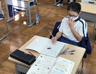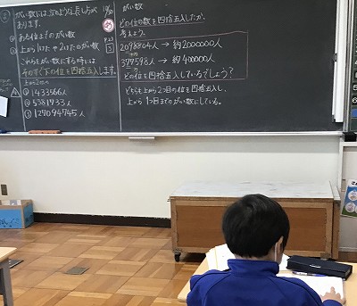 算数は、引き続き「がい数」の学習を行いました。昨日に習った「四捨五入」を使って、数字を概数に直す作業を行いました。