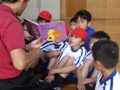 中間休みに、体育館でハロウィン英語絵本の読み聞かせをしました。