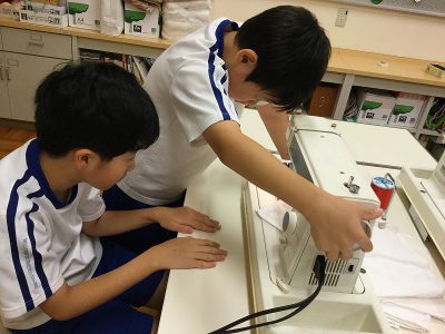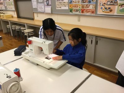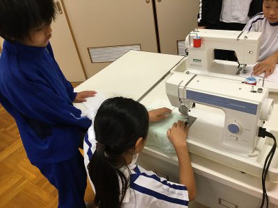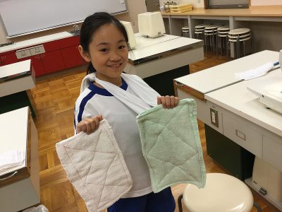 また、家庭科室の古タオルで作った分は、2枚縫った内の1枚を選び、みんなで持ち帰りました。赤糸のかわいいふきん、どうぞお使いください。