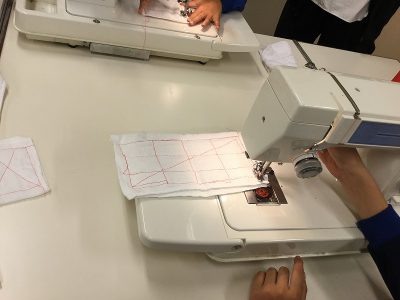 今日は、赤糸を使ったミシンの「ふきん縫い」を行いました。